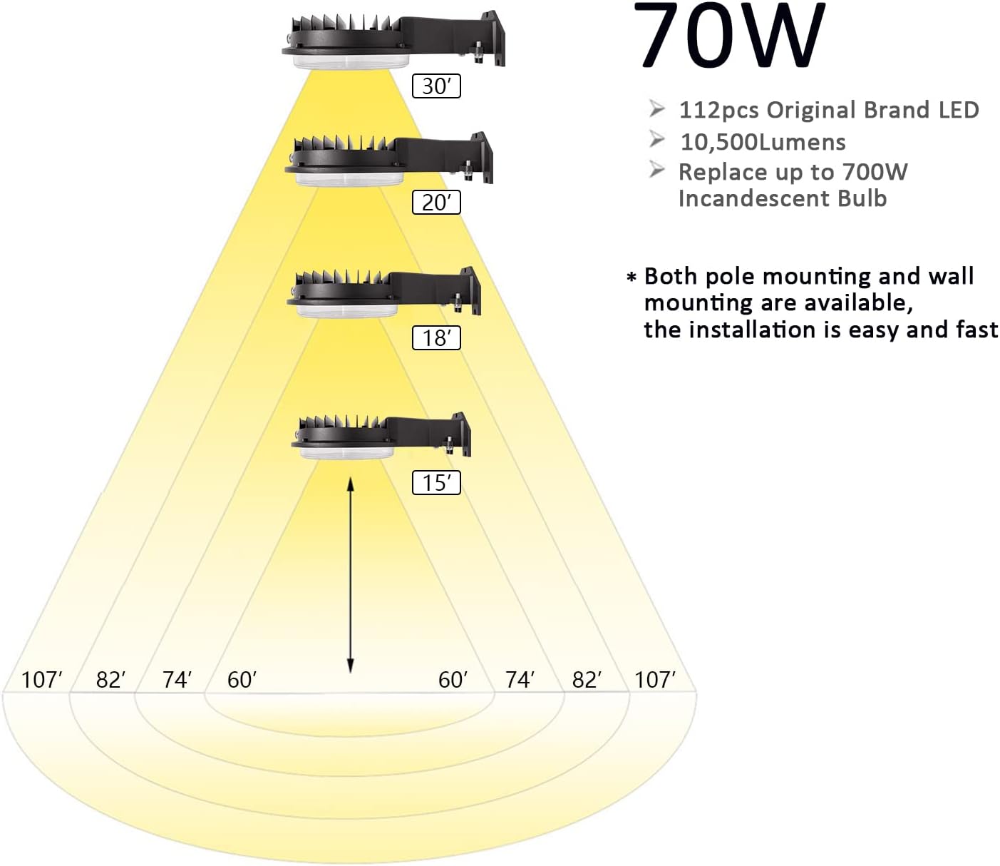 • BRAND LED AND ULTRA BRIGHTNESS: SZGMJIA led yard light adopts original brand leds, with 7,500lumens output, 5000-Kelvin daylight white, which is perfect matches the brightness & color of illuminating backyard, barns, farms, parking lots, garages and alleyways.