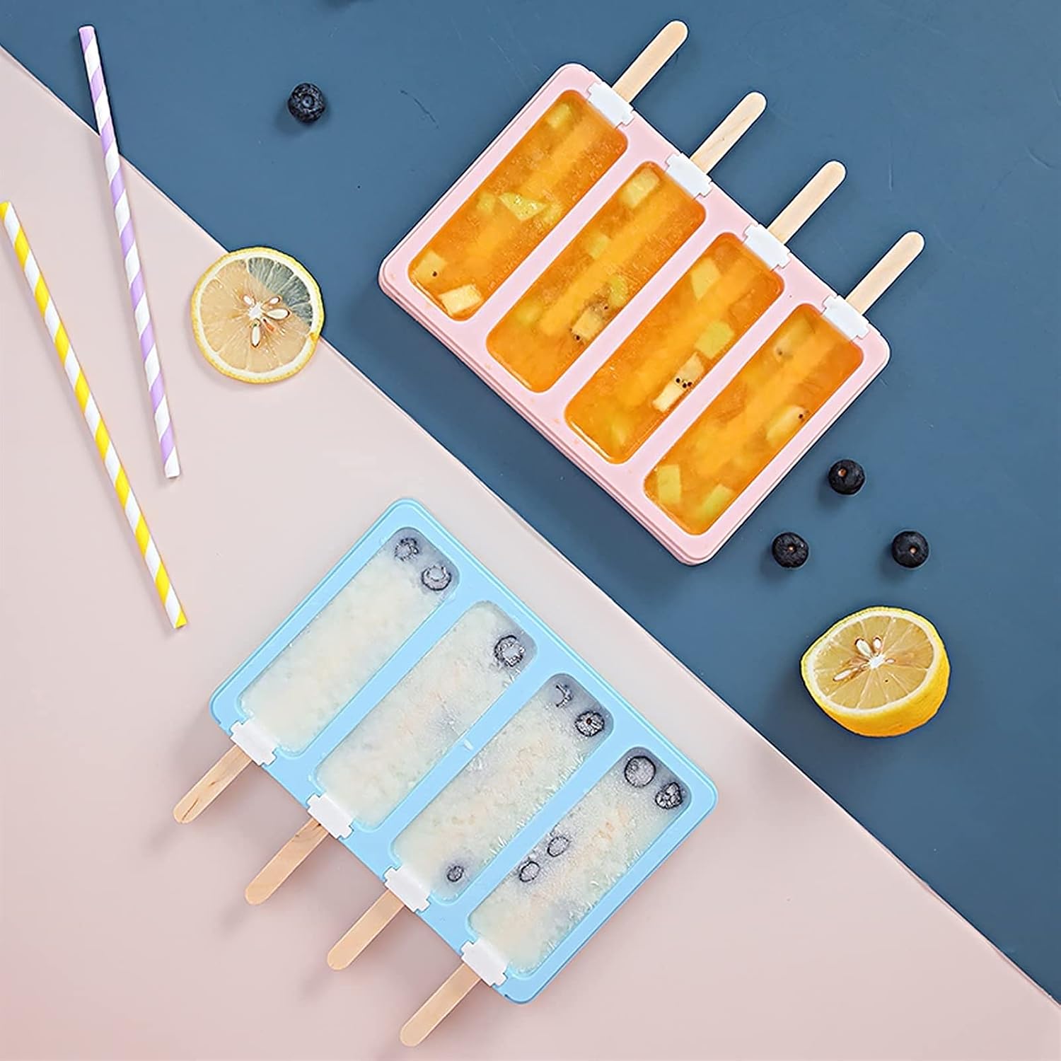 Specifications:Color: pink and blue / yellow and greenMaterial: food grade PPSize: 19.7*12.8*2.7cmPackage includes:2 x Ice Lollipop Molds100 x Wooden SticksCustomer Service: We not only provide high quality products, but also provide quality after-sales service.