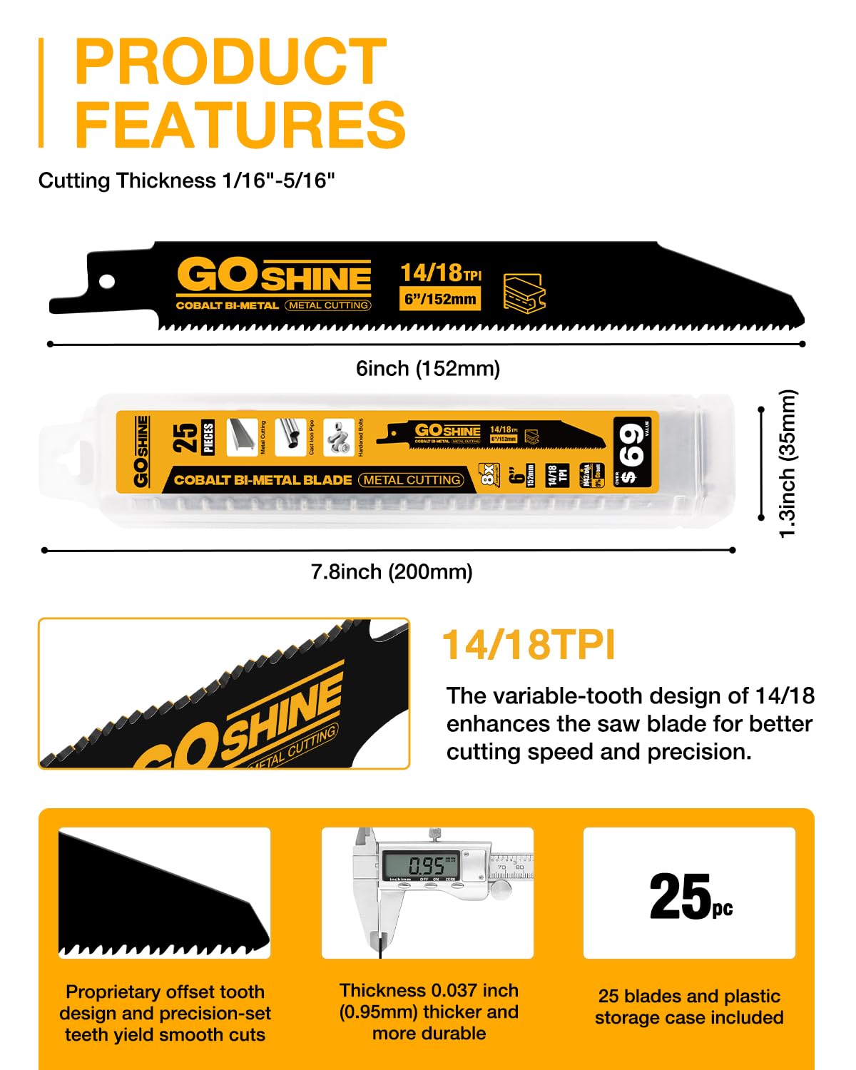 • 【Product Specifications】25Pcs of 9-inch 14/18TPI reciprocating saw blades for medium to thick metal cutting; blade thickness 0.04 inches, packaged in a convenient plastic box for easy access.