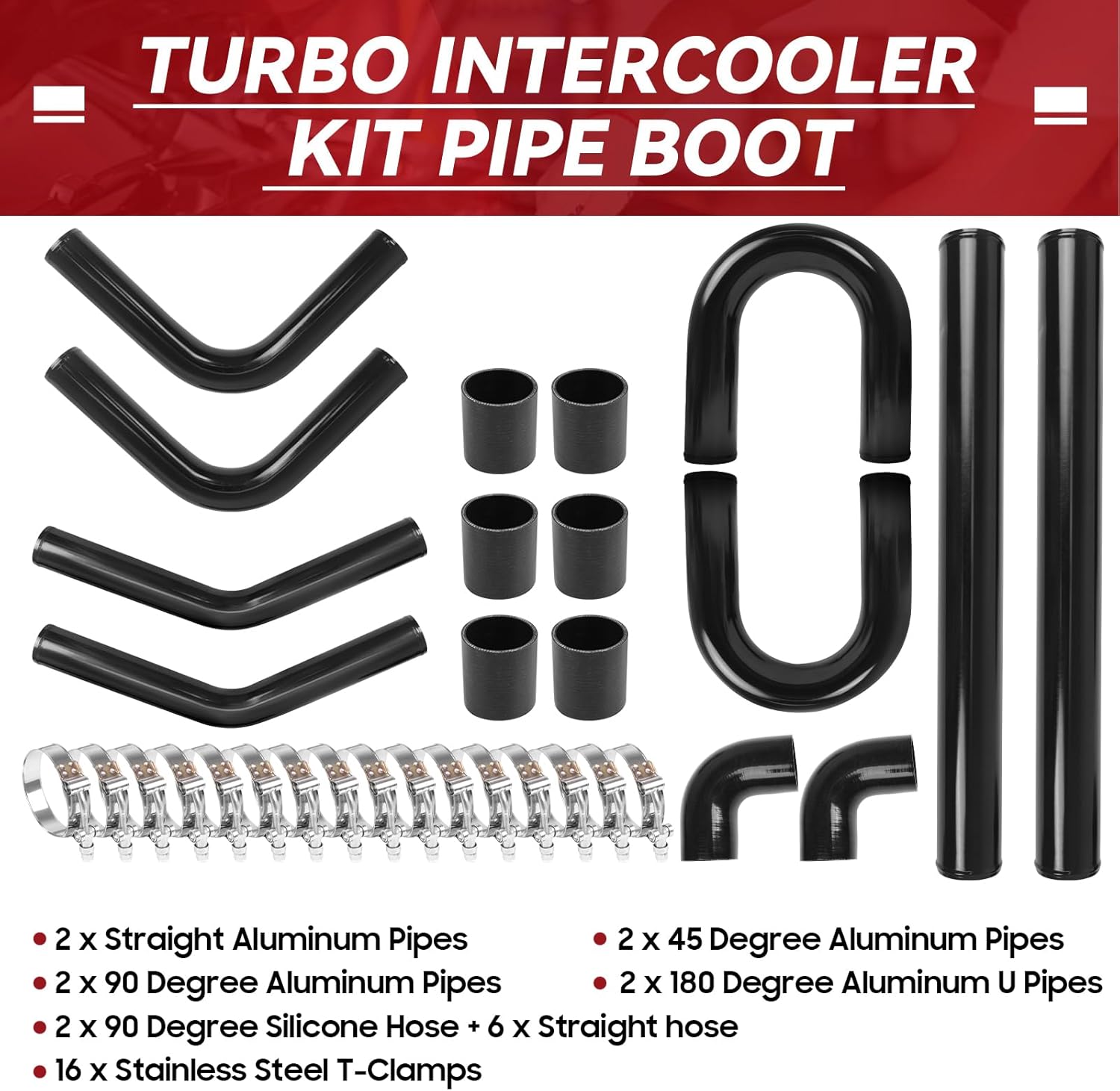 • 【Package Includes】 2 x Straight Aluminum Pipes; 2 x 45 Degree Aluminum Pipes; 2 x 90 Degree Aluminum Pipes; 2 x 180 Degree Aluminum U Pipes; 2 x 90 Degree Silicone Hose + 6 x Straight hose; 16 x Stainless Steel T-Clamps