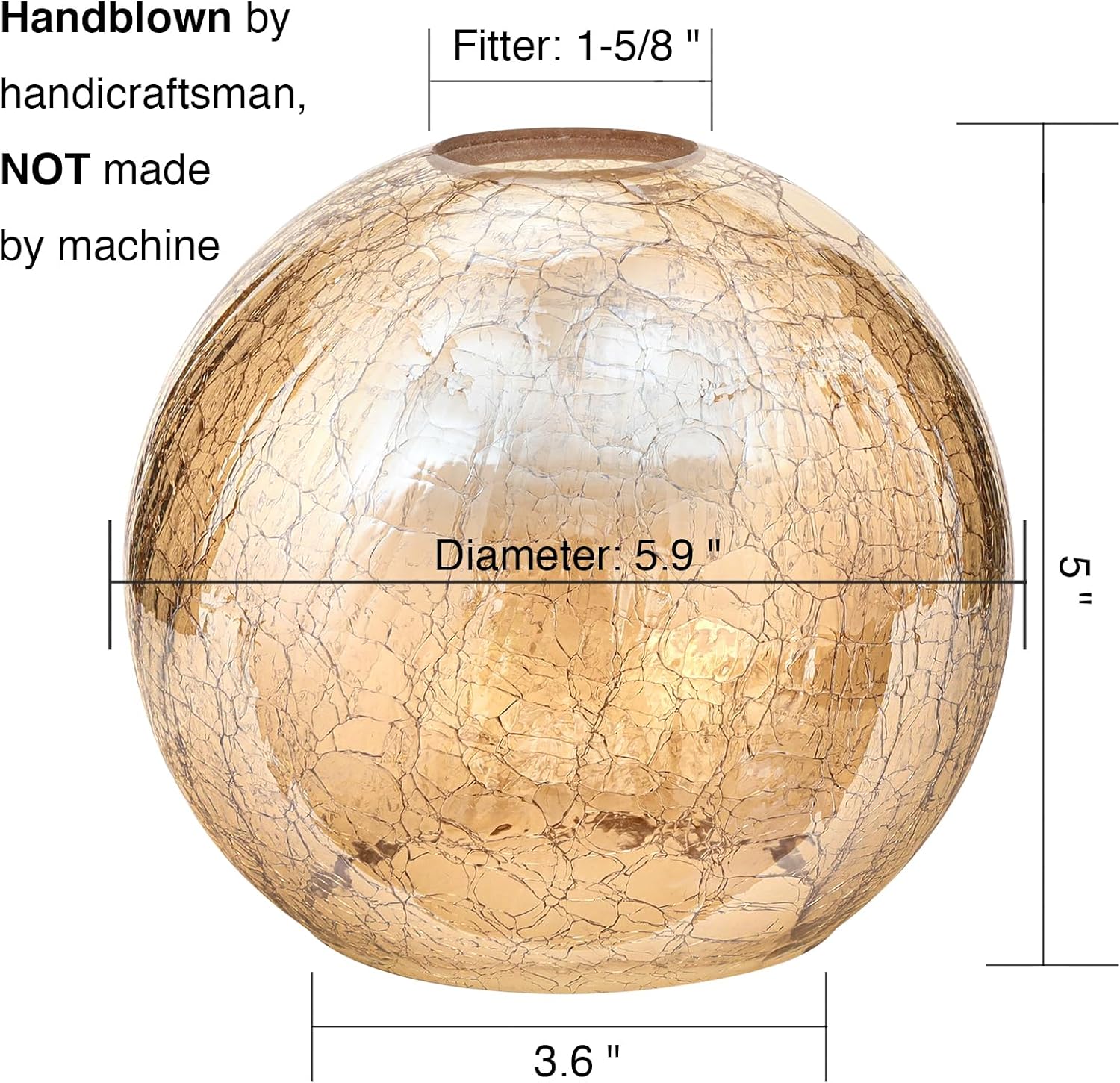 GoldSwift 3 Pack Glass Globes for Light Fixtures Replacement, 5.9" Diameter, Clear Seeded Round Glass Globe Lampshade Cover for Pendant Light Wall Sconce Chandelier Features: ☀The seeded glass globes cover shade create a sparkling feeling light transmission, bubble will provide subtle modern and contemporary character into any lighting design to bathe your house in stylish and modern style, ideal for any home, office or adorning any bedside. ☀ Fit for rustic and modern style light fixtures ☀Quality assurance with strict quality inspection and quality packaging Specification: ☀Material: Glass ☀Color: Clear Seeded ☀Fitter Size: 1 5/8 inches ☀Dimensions: 5.9 inches (diameter) * 5 inches (tall) ☀Number of the item: 3 pack ☀Finished Type: Polished ☀Manufacturing Method: handblown (The handblown glass shade is resistant to high temperature, has high light transmittance, is durable and not easy to turn yellow) Customer Service: ☀Free replacement or full refund for any defects ☀Lifetime services, please feel free to contact us if any problems Package included: ☀3 x Clear Seeded Glass Globe Shade Replacement Notes: ☀The socket ring for fixture is not included