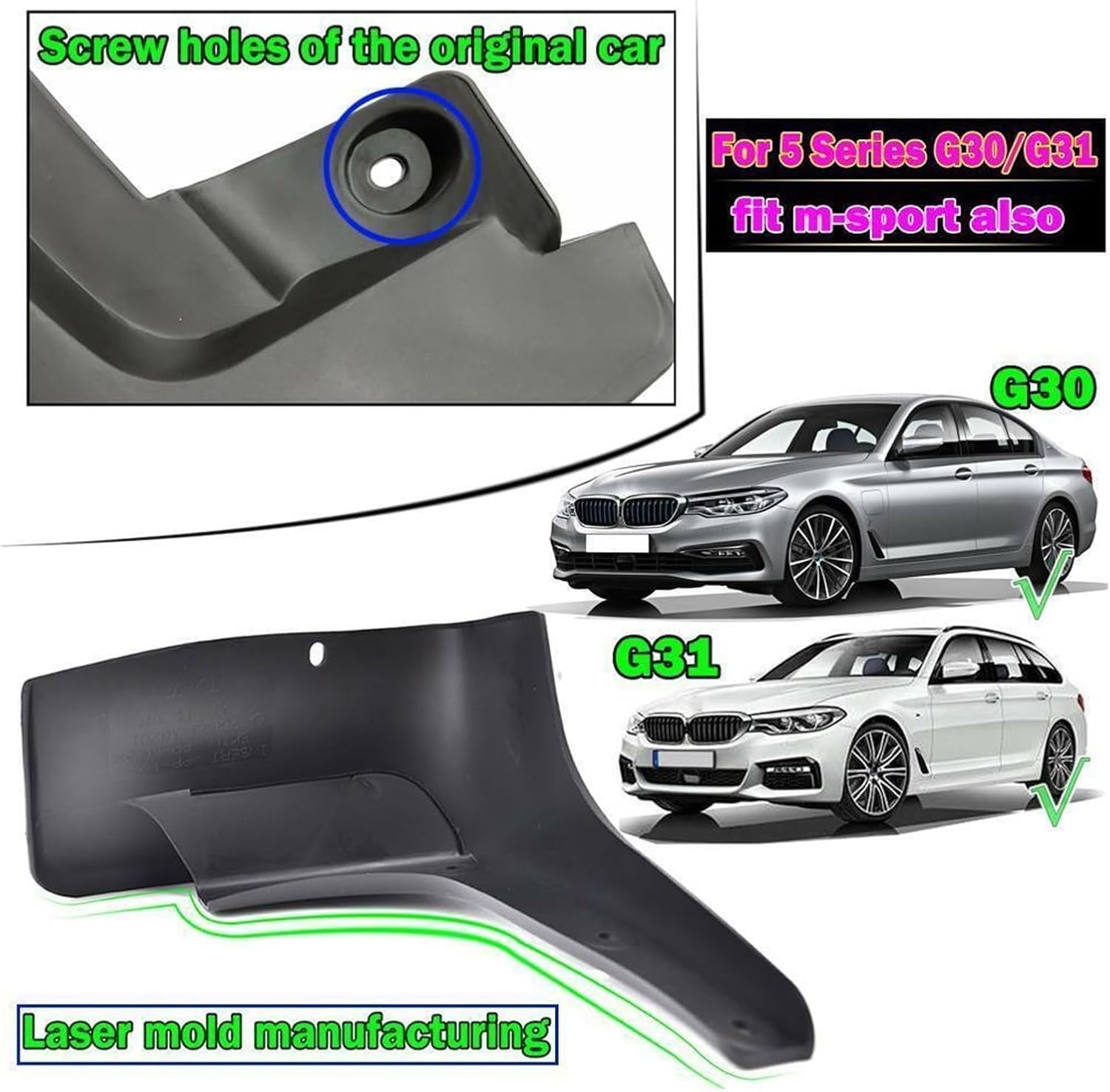4x Car Mudguards Compatible for BMW 5 Series G30 G31 Saloon Touring 2017-2022 Mudflap Mud Flaps Splash Guards Mudguards fenders AccessoriesCondition: 100% Brand New UnusedPackage Include:4 x Mud Flaps (2 X Front + 2 X Rear)a Bag Of Screw FixingsWelcome to our auto parts sales shop, we focus on providing you with the most comprehensive and professional selection of auto parts, so that your driving more peace of mind and comfort. No matter what kind of accessories you need, we will provide the best selection and the best quality service. Enjoy your shopping!
