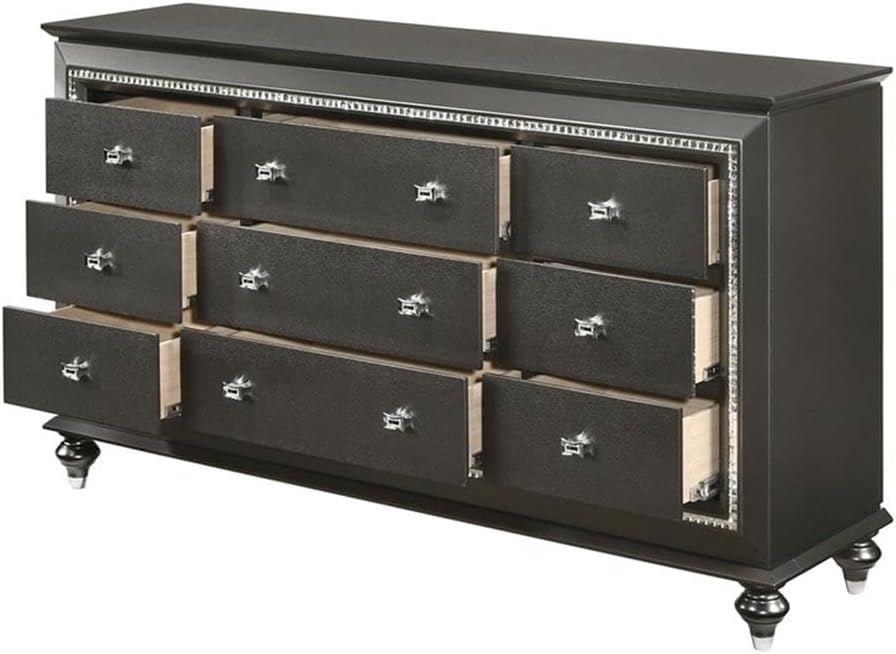 With the smooth metallic gray finish of the solid woods and veneer, this dresser offers nine storage drawers allow you to keep your sleeping area nicely neat. It also has beautiful bun feet. Crafted with a transitional look that is an ideal addition to any bedroom, the dresser is accented with textured front and a crystal-like sparkling trim. Its crystal-like trimming creates dazzling glow for your master bedroom.Dimension:66" x 18" x 39"H
