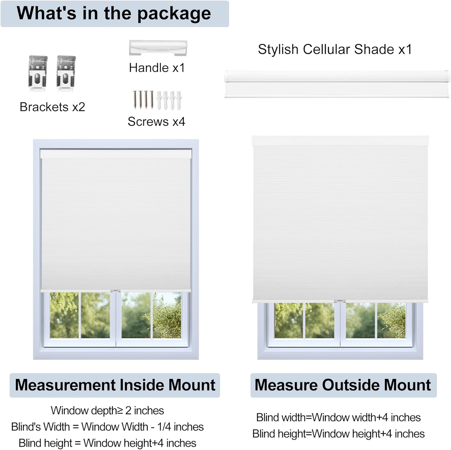 | Included Components | Cellular Shade, Handle, Matching Color Upper and Lower beams, Mounting Hardware, User Manual |