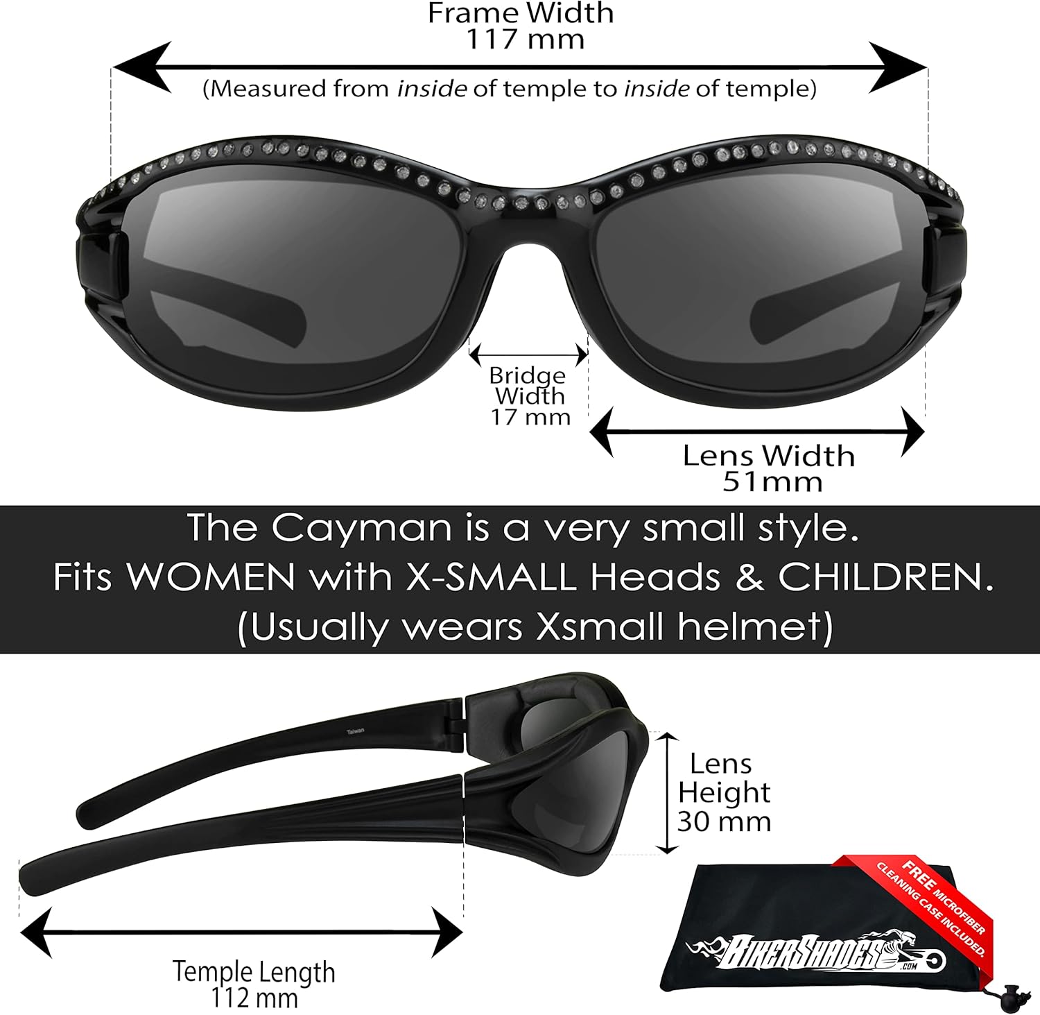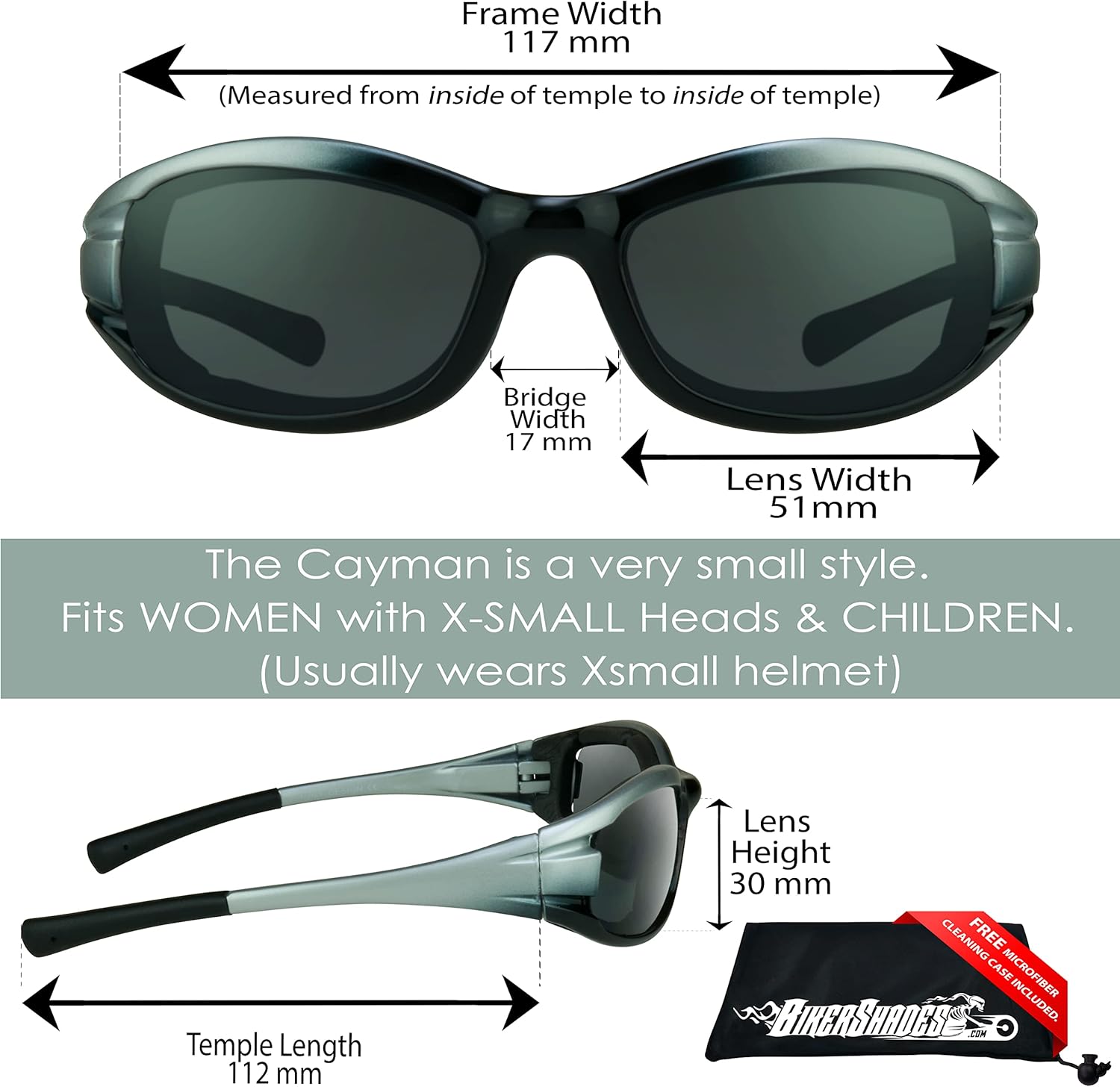 Are you having a hard time to find SMALLER PETITE motorcycle riding sunglasses? If you are, the Cayman biker sunglasses are the perfect pair for you! The Cayman motorcycle glassesare equipped with vented foam cushions to seal out UV rays, wind, dust and debris while you are riding. No more tearing; or dry, irritated eyes! The Cayman is our top selling style for PETITE ladies, teen and kids. Awesome two colorframes match your bike or your favorite accessories. In addition, these lenses are safety impact resistant polycarbonate with 100% UV protection.Choose from various lens colors:DARK SMOKE, CLEAR, YELLOW or MIRRORED Lenses.DARK SMOKE LENS: filters out the most light in sunny conditions compared to any lens color. Provides a natural view without distorting colors. CLEAR LENS: provides a natural view. Clear glasses are often used as safety glasses or for nighttime sports such as motorcycle riding, cycling, or playing baseball.YELLOW LENS: also known as night vision lens eliminates the "halo effect" around lights and brightens vision at night. For cloudy days & rainy days, yellow lens also eliminate haziness and increases clarity.MIRRORED LENS: eliminates glare and provide clear and comfortable vision. PLEASE NOTE - The frame is vey SMALL!!