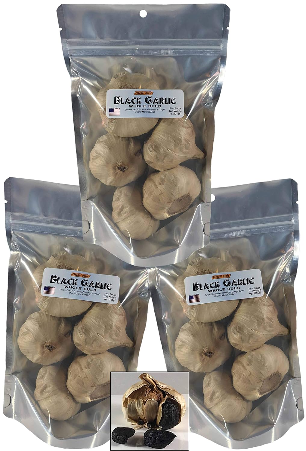 BLACK GARLIC by GOURMET MAGIC is made the traditional way: by warming garlic at over 140F for more than 30 days. In food science terminology, this “browning” is caused by the “Maillard reaction”: natural carbohydrates in the garlic break down into sugars, and the proteins break down into amino acids, which react forming compounds that are both delicious and incredibly healthy. The flavors are complex and rich, and the already wonderful health benefits of garlic are enhanced well beyond regular garlic. Black Garlic originated in Korean cuisine over 4000 years ago, and it is now being applied to a variety of cuisines. Raw garlic is too harsh to eat, but during the black garlic aging process, these harsh notes are converted into delicious sweet and "umami" (meaty) flavors, with complex aromas including balsamic vinegar and tamarind. Black Garlic has become a sought-after ingredient used in high-end cuisine, as in or alongside charcuterie, cheese plates, or pureed and blended into gourmet spreads and toppings.