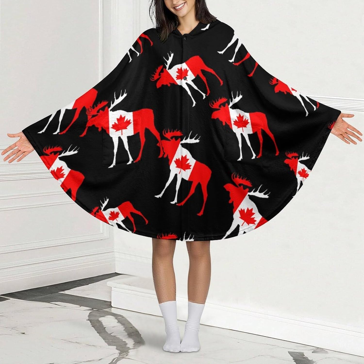 The wearable blanket is made of soft and comfortable flannel fabric, which makes you feel warm in spring, autumn and winter. It has a cape-like shape, a button closure for easy wearing and taking off, and two pockets.