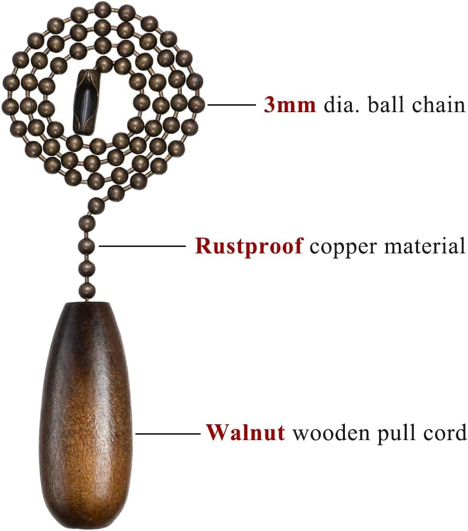 Ceiling Fan Pull Chain, 2 Pieces 12-inch Long 3mm Diameter Beaded Ball Chains Bronze with Walnut Wooden Pulls Cord