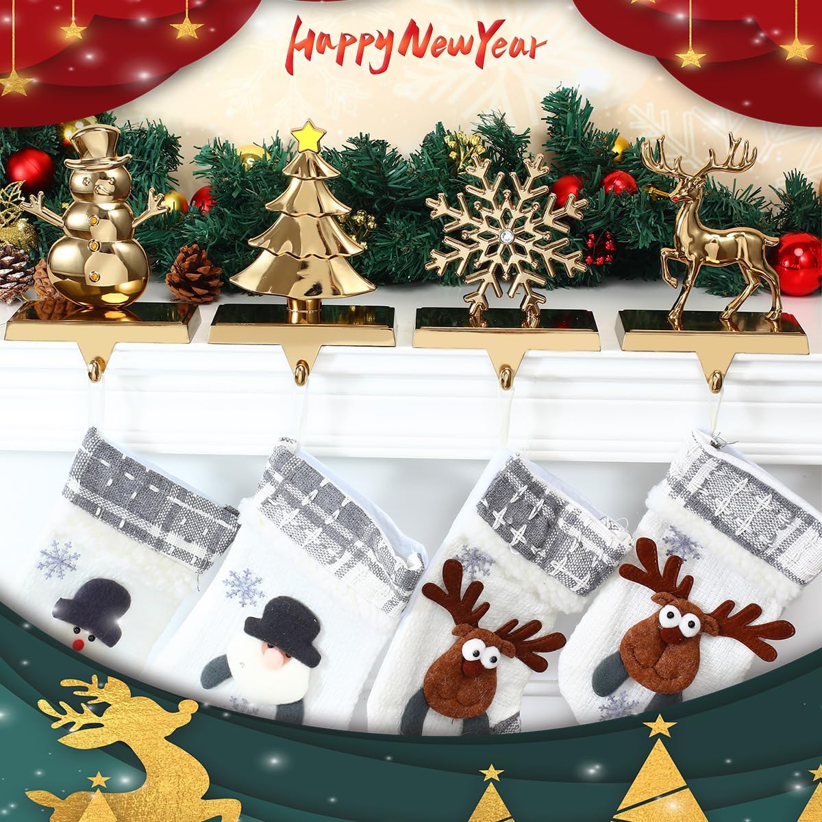 Classic Design -- The classic Snowman, Snowflake, Reindeer and Pine Tree design. Crafted with a unique holiday cheer creating beautiful memories to treasure for years to come. High Quality - Stocking holders for mantle set, made of high quality material which is not flimsy and not bend while handing Christmas decorations. Sturdy materials will last for holiday season after season, can be used it again and again. Non-Slip Stocking Holders -- The bottom of the hook has a non-slip design, prevents it from sliding over a hard surface. It can bear 5 pounds, you can fill your Christmas stockings with many gifts. Application - Perfect for Christmas party or Easter holiday decorating, collectible display. Christmas stocking holders for fireplace or mantle. Multi-Function -- It won't interfere with other Christmas decor on the mantel,Sits Well On Mantles, Bookshelves, Stair Cases & More. Specifications: Color:Antique Gold Material: metal and plated Size: 4.9" x 2.6" x 6.9" Quantity: 4 pieces(reindeer stocking holder/ snowflake stocking holder / snowman stocking hanger / Christmas tree stocking holder)