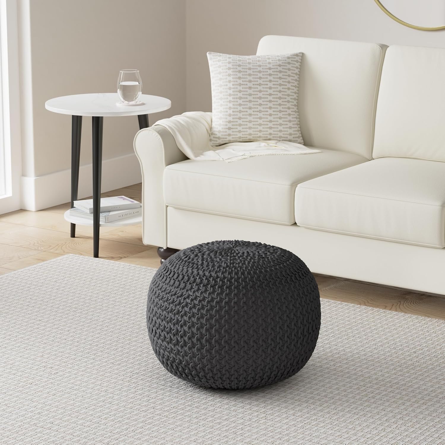 Brighten the atmosphere of any interior space with a playful knitted statement piece of bold style and cozy comfort. The compact pumpkin shape and classic cable knit makes this the perfect seating for children in a nursery or a colorful footrest in a stylish living room. Whether you’re looking to put your feet up after a long day or if you’re in need of extra plush seating, this pouf offers a variety of functions for you and your guests to discover.* Cotton Knit Weave