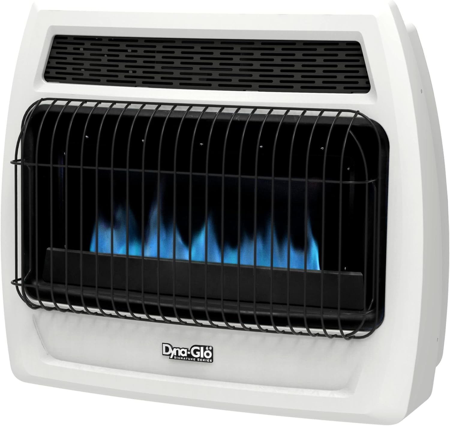 Dyna-Glo wall heaters are the ideal choice for safe, indoor supplemental heating. This state-of-the-art vent free technology does not require a flue or chimney. These heaters are great for use in your home, cabin, or garage. Since these heaters do not require electricity to operate, they make an excellent choice for everyday heating, and emergency situations when the power goes out. Using blue flame heating technology, heat is distributed similar to your central home heating system. This Blue Flame Wall Heater burns with 99. 9% efficiency, and operates on Natural Gas only. Not for sale in California or Canada. Check your local regulations on installation restrictions and requirements. DEPENDABLE - Ideal for daily supplemental or emergency use, such as power outages ECONOMICAL - Cut heating bills by warming only occupied areas COMFORT – Manually adjust the heat setting to your desired temperature SAFE - Built-in oxygen depletion sensor (ODS) immediately shuts down the heater if carbon monoxide or lack of oxygen is detected CONVENIENT – One continuous press of the battery assisted igniter makes ignition quick & effortless VERSATILE - Includes all necessary hardware & bracket for wall mounting UPGRADEABLE - Separately sold optional base legs (WBL100) provide the alternative of floor mounting. Separately sold optional Wall Heater Fan (WHF100) distributes heat in a quiet, yet powerful way.