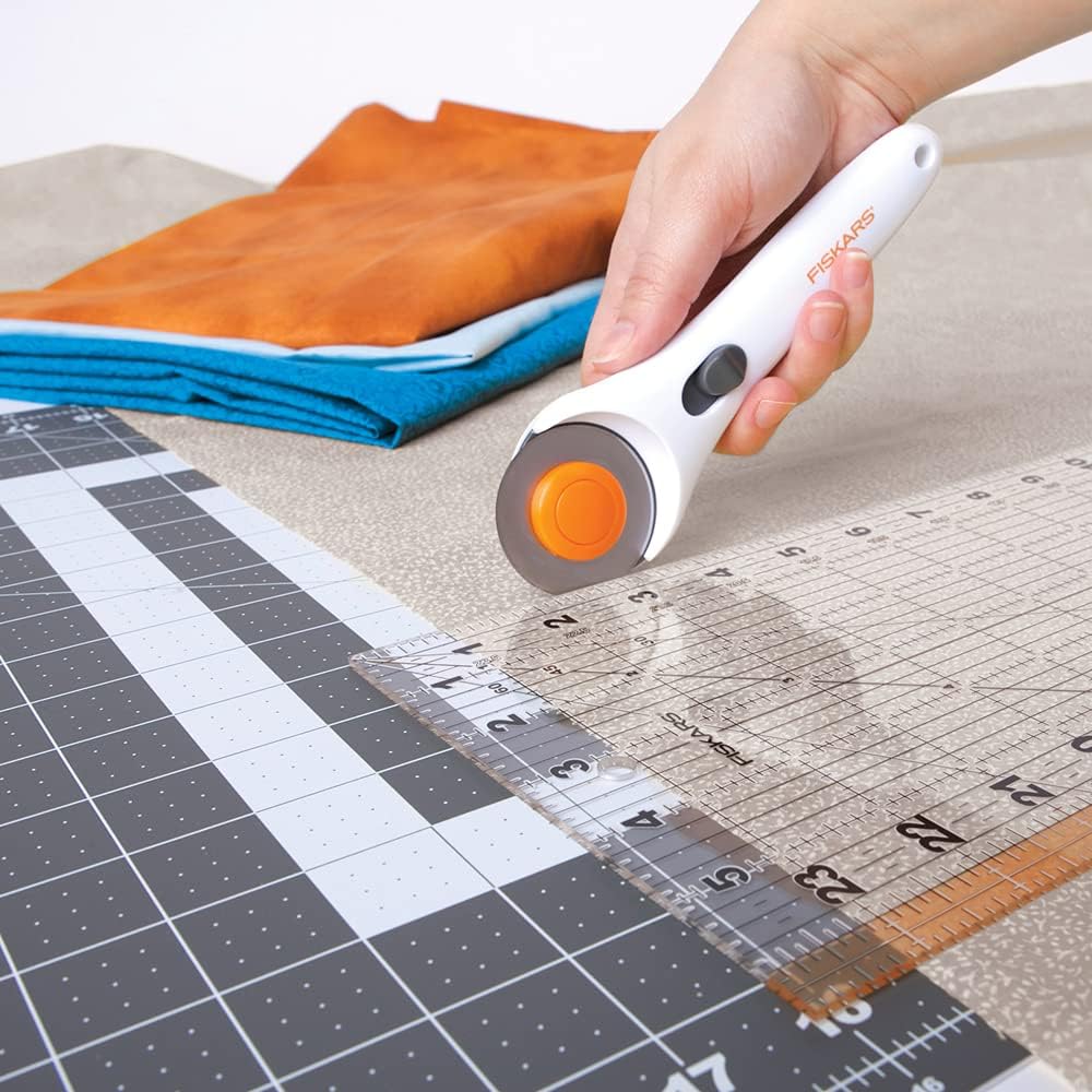 • INCLUDES: (1) Fiskars Comfort Loop Rotary Cutter with 45mm blade, (1) Fiskars 18" x 24” Folding Cutting Mat, and (1) Fiskars 6" x 24" Sewing Ruler; Lifetime Warranty (excludes blade and cutting mat)