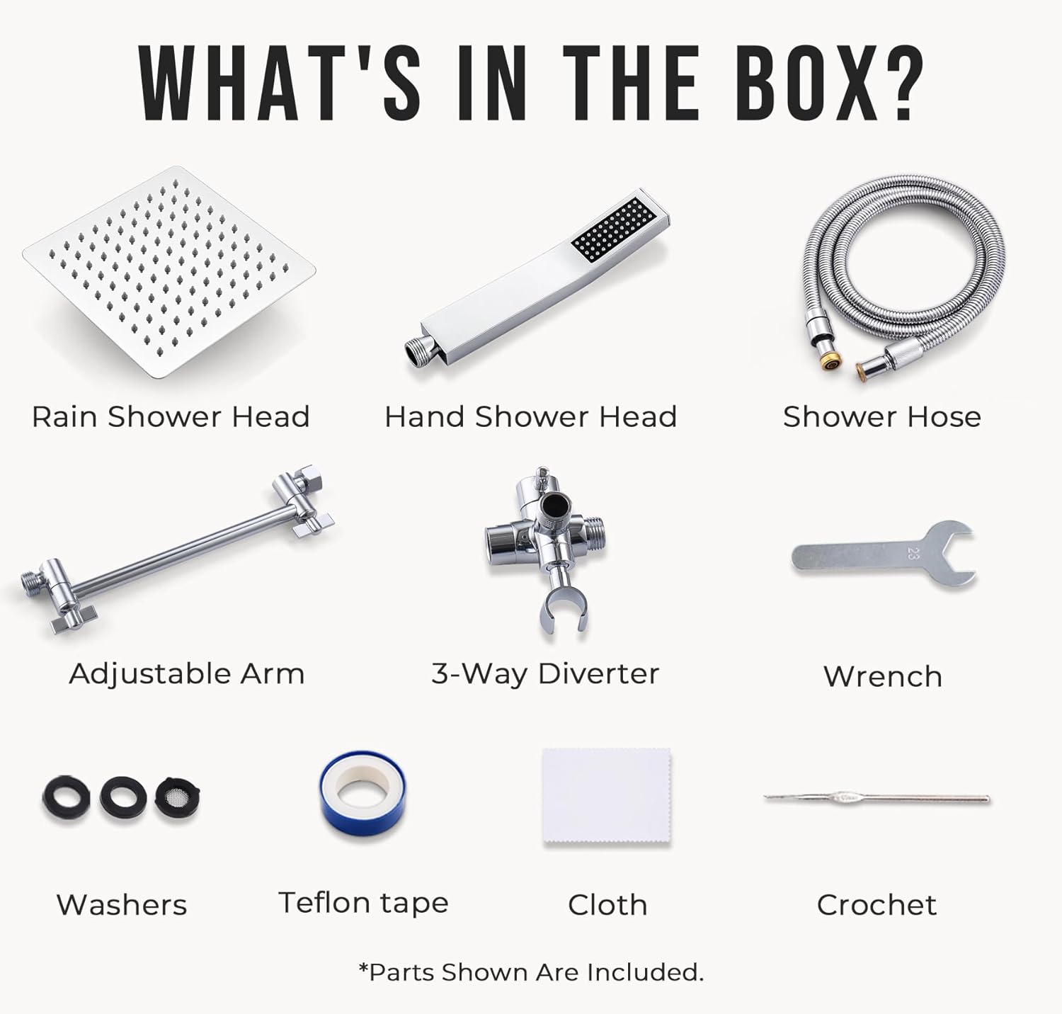 | Included Components | Rainfall shower head, Handheld shower head, Diverter, Extension arm, Hose |