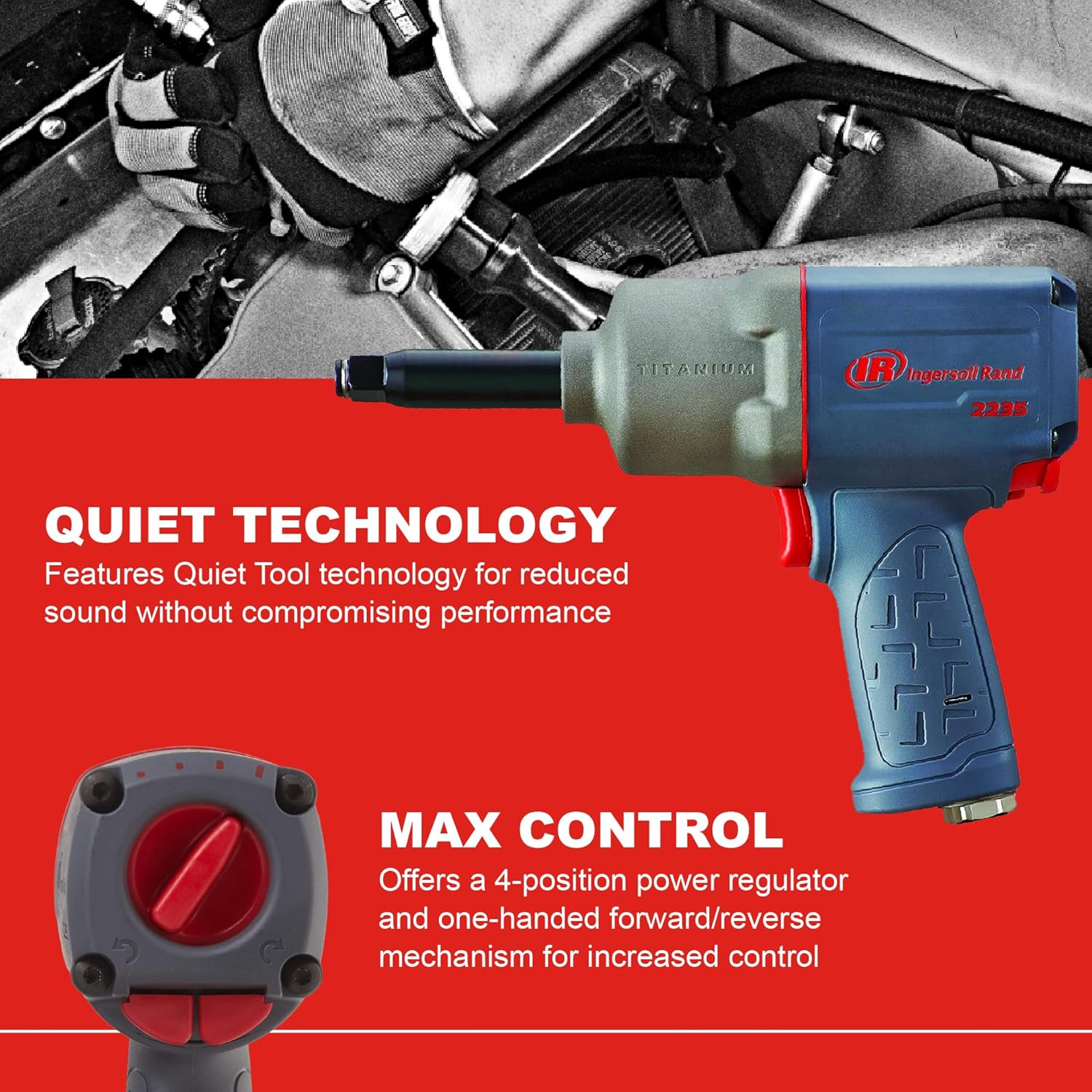 Introducing the Ingersoll Rand 2236QTIMAX DXS2 Air Impact Wrench, a powerhouse tool engineered to revolutionize your work experience. With the Drive Xchange System (DXS), this wrench offers unparalleled versatility, torque, and control. Whether you’re tackling automotive repairs, industrial maintenance, or construction projects, the DXS system allows seamless transition between 3/8", 1/2", and 3/4" drives, reducing the need for multiple tools and maximizing productivity.The patented motor design offers a 4-decibel reduction compared to standard impact wrenches, and the patented Direct Greasing System simplifies maintenance by allowing direct greasing of the tool’s hammer, optimizing efficiency and prolonging run time. With the ability to swiftly replace worn or broken anvils, this tool lets you enjoy reliable performance and keep working at peak power.Crafted with ergonomics in mind, this compressor tool boasts a smaller, lighter, and better-balanced design, weighing under 4.5 lbs and measuring 7.4" in overall length. The ergonomic construction minimizes user fatigue, enhancing comfort during prolonged use. This impact wrench is also constructed from high-quality materials to withstand the rigors of demanding work environments. Whether you’re a professional or a DIY enthusiast, the 2236QTIMAX is the ultimate solution for efficient, reliable, and comfortable power-tool performance.Ingersoll Rand is a trusted name in industrial innovation and excellence. With a rich legacy spanning over a century, Ingersoll Rand has continuously pushed the boundaries of engineering to deliver cutting-edge solutions that power progress across industries worldwide.