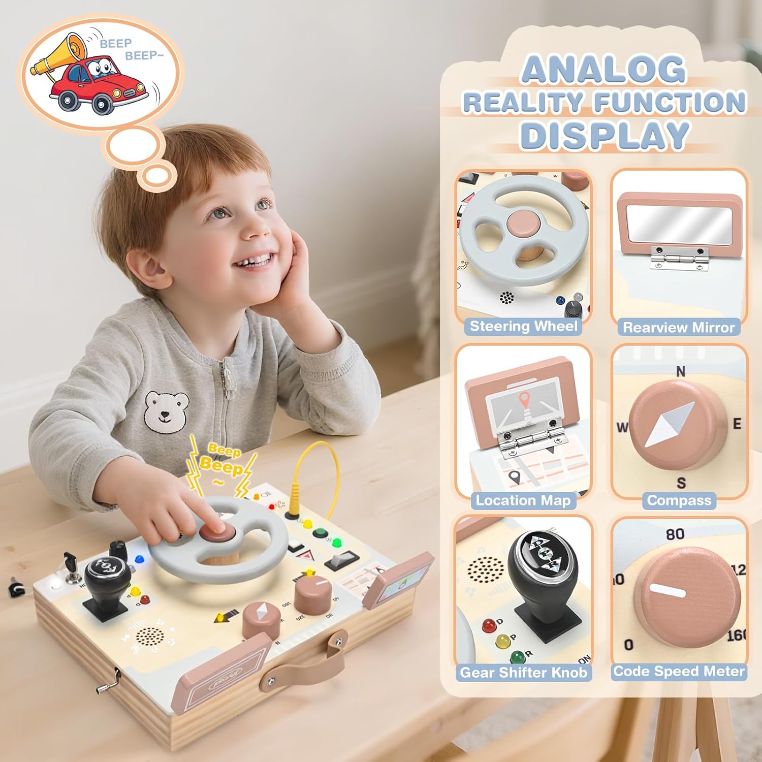• [Upgrade Multiple Style Designs] Add variable speed LED switch design and multi-style switches (easy press)to enrich playing methods. The colorful LED Montessori busy board keeps the baby busy and the main switch supports safety to play while learning.