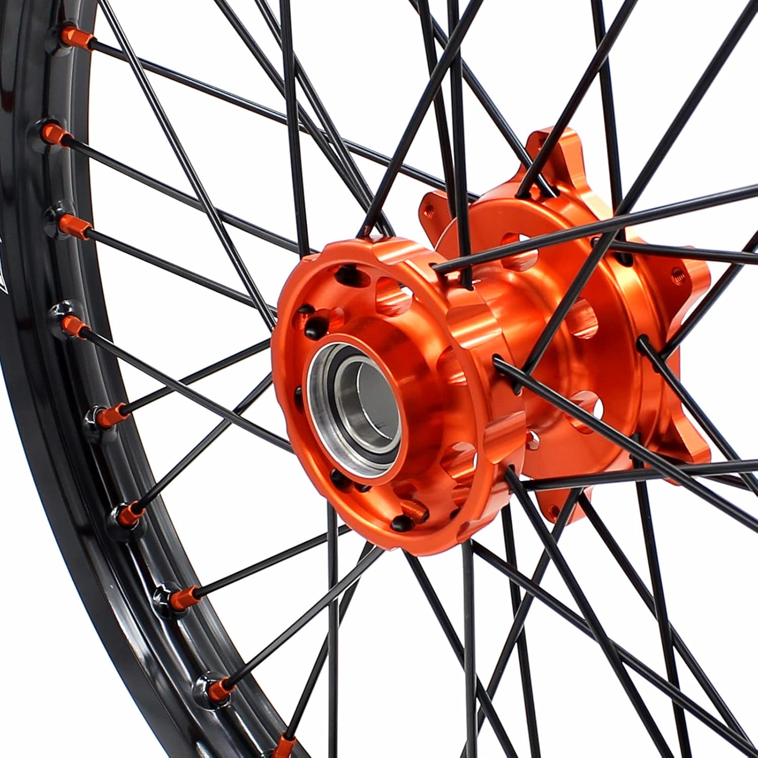 KKE 21/19 MX Dirt bike Motorcycle Spoke Wheels Rim Set Compatible with KTM SXF XCFFeatures:100% Brand New, Strong enough for off-road and racing6082-T6 Aluminum CNC Hub, Stronger than stock hub7050-T6 Aluminum Gloss Rim304 Stainless Steel Spoke with Alloy NippleItem Can Work with Stock PartsWheels are Already Assembled Well (With Hub, Rim, Spoke, Nipple and Bearing)The Seals and Spacers are Packed In Small Package.The Pictures show exact wheels you will receiveKKE wheels will fit your bike Plug and PlayFitment:Compatible with KTM 125-530CC All Model 2003-2024Wheels Could Fit OEM Disc and SprocketPlease Check The Fitment Above Before Check OutItem Color:Orange CNC HubBlack GLM RimBlack SpokeOrange NippleAnodized Color, Last a long timeInstruction For The Order:1. Please Inform Us The Year And Model Of Your Motorcycle Before Or After Check Out.2. After The Shipment Of Package, We Will Notify You The Tracking Number.3. Please Feel Free To Contact Us If You Require More Detailed Information Or Have Any Special Instruction For The Processing Of Your Order.4.Please Note Wheels are Signature Required Upon Delivery Due To Safety Concern.Warranty Information: 1.We Will Accept Return If It Is Not Compatible / Wrongfully Sent / Being Damaged2.Please Contact Us Before Send The Merchandise Back 3.Customer Is Responsible For Return Freight Charges If There Is Nothing Wrong With Our Item.
