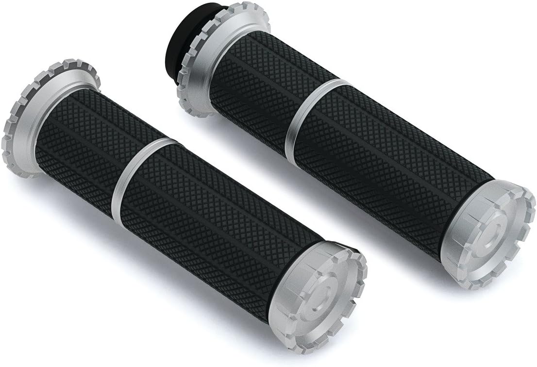 The Kuryakyn 3587 Universal Riot Grips for 7/8" Bars in Satin Black has removable end caps that allow installation and use of bar end mirrors or turn signals. Features premium EPDM (Ethylene Propylene Diene Monomer) rubber compound that eliminates vibration. Cast aluminum trim rings in satin black for an additional custom touch. Designed with a rugged thin profile; soft and durable EPDM rubber provide control and comfort. Includes (1) Right-Side (Throttle) Grip — Larger Inner Diameter (1.035" ID), (1) Left-Side (Clutch) Grip — Smaller Inner Diameter (.875" ID), (2) Silver End Caps (symmetrical), (2) Tubes of Adhesive; suggested for installation (not Included): utility knife with a sharp blade, sandpaper, electrical tape and non-permanent marker. The Kuryakyn 3586 Universal Riot Grips for 7/8" Bars in Satin Black are custom fit for use with multiple motorcycles with: universal: 7/8"diameter handlebars, overall length 5" x 1-1/2 diameter, may require removal of any ribs on OEM throttle sleeves.