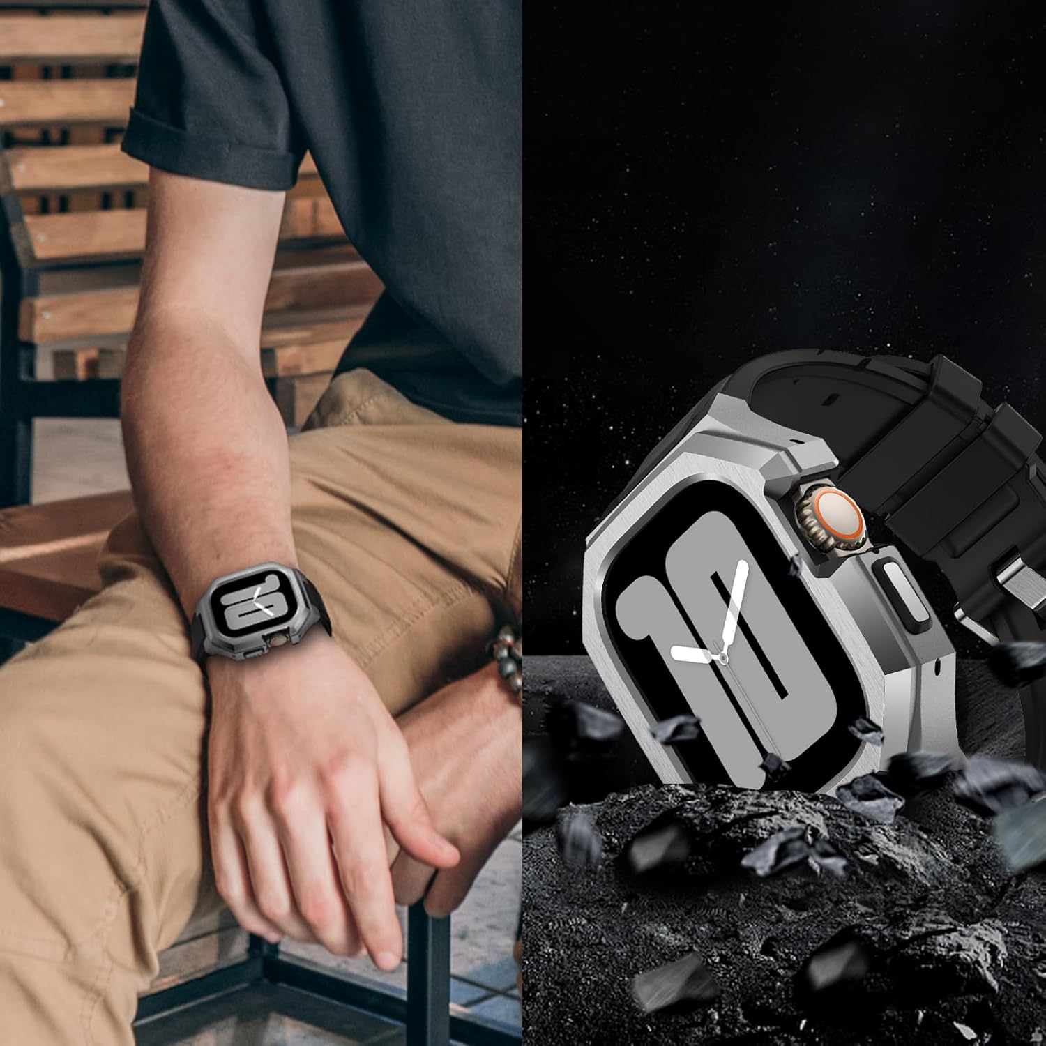 • 【Easy to Install & Remove】The one-piece case with iwatch band.Snap on make a quick and easy installation,no screws and any tool need.The inside case buffer layer made of soft TPU material,won't scratch your Apple Watch.The back of the band is hollowed out, which can be charged directly without removing the case bumper.