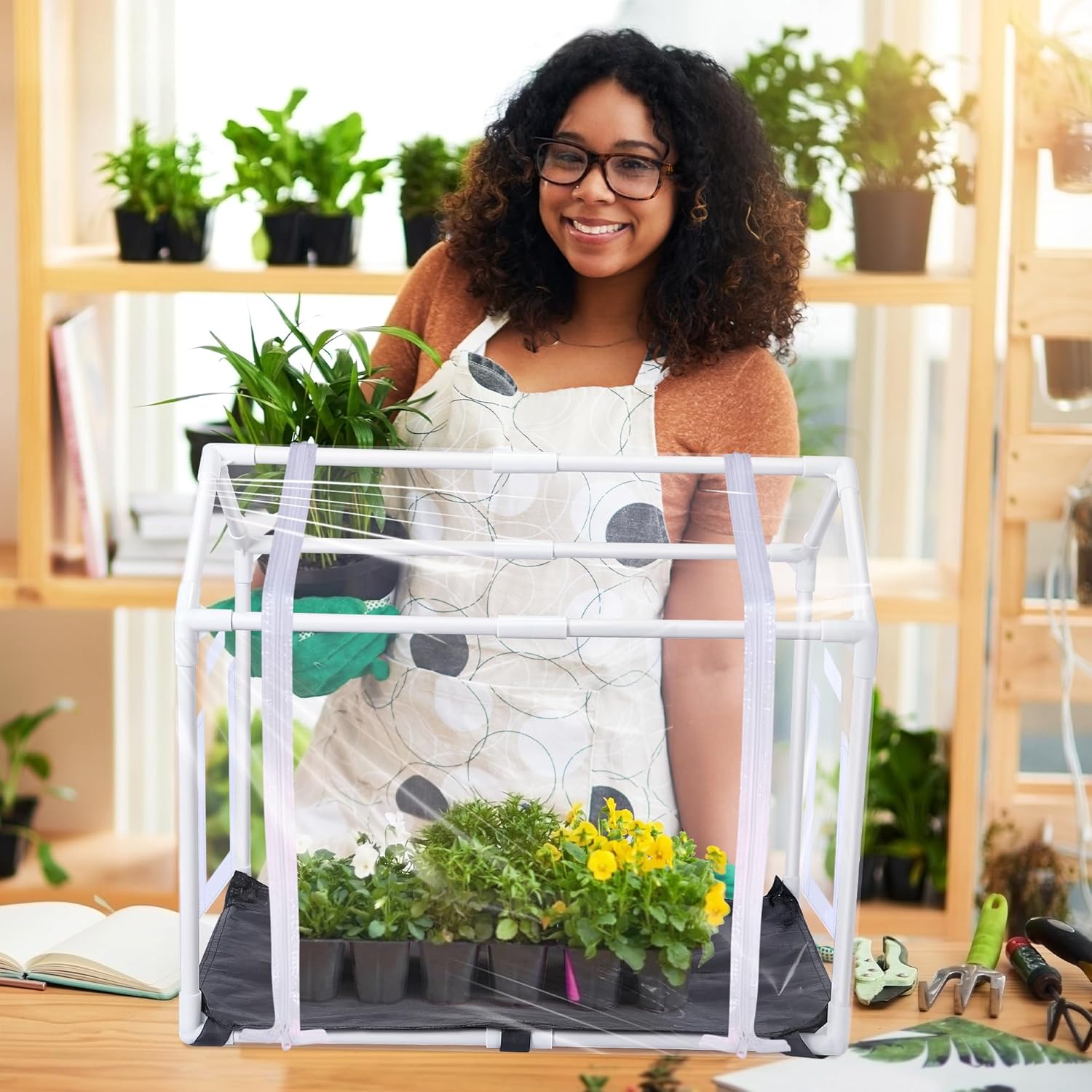 Whether you're a seasoned gardener or a novice, the Mini Greenhouse for Indoor use is the ultimate tool for growing a diverse range of plants in the comfort of your home. Feature & Function: Light weight, easy to carry. Durable for using, can service for a long lifespan With excellent sealing, corrosion resistance, not easy to fade, break, aging resistance Easy to install without using a long time Specification: Material: High quality plastic and metal PE Potting Mat is made of waterproof PE material Frame Size: 23.62 inches (L) x 15.75 inches (W) x 19.69 inches (H) PE pad Size: 23.62 inches (L) x 15.75 inches (W) Warm tip: Please read the description carefully before purchase Please contact us if you have any problems The maximum heat resistance temperature of the bottom mat is 80 degrees of Celsius