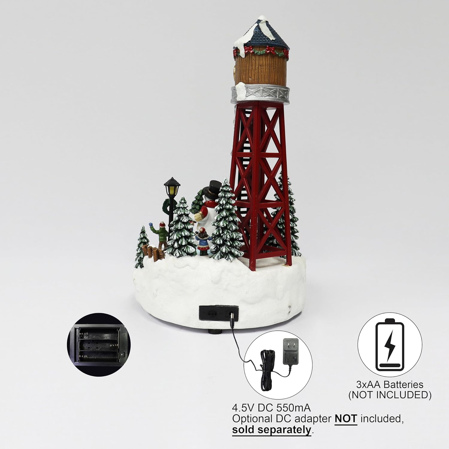 Christmas Village 14”H Polyresin LED Lighted Water Tower with Animated Scene (B/O, with Adapter)