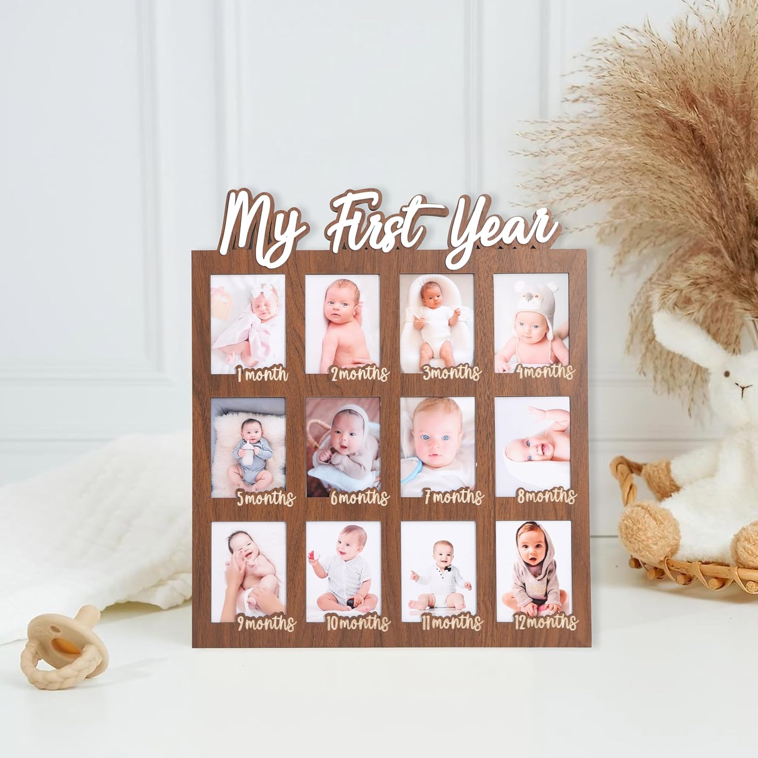 This wooden 1st birthday photo board is a great choice for recording a cute little one's first birthday with itIn the process of growing up, we often hope to find a way to record those fleeting moments. Our first-year photo board provides an ideal platform for depicting the growth process of cute little onesUsing wooden style monthly photo boards is a way of respecting and cherishing the growth of little cuties. Whether as party decorations or souvenirs, it will bring endless joy and beauty to their growthThe 1 to 12 month photo display board of this wooden board has a smooth surface and is easy to stick. You can stick the cute monthly photos in the corresponding box, which is not easily damaged or deformed and can be used for a long timeOur lovely wooden photo board is easy to use. After your birthday, you can dress up our decorations in your cute room and bring back the birthday moment in your heartThe simple and rustic wooden monthly photo board can be paired with other decorations such as flowers, ribbons, balloons, etc. They will make your celebration more colorful and impressivePackage includes1 x 1 year old monthly photo board made of woodFinally, thank you for browsing. If you think it's good, please gently add it to your shopping cart and have it