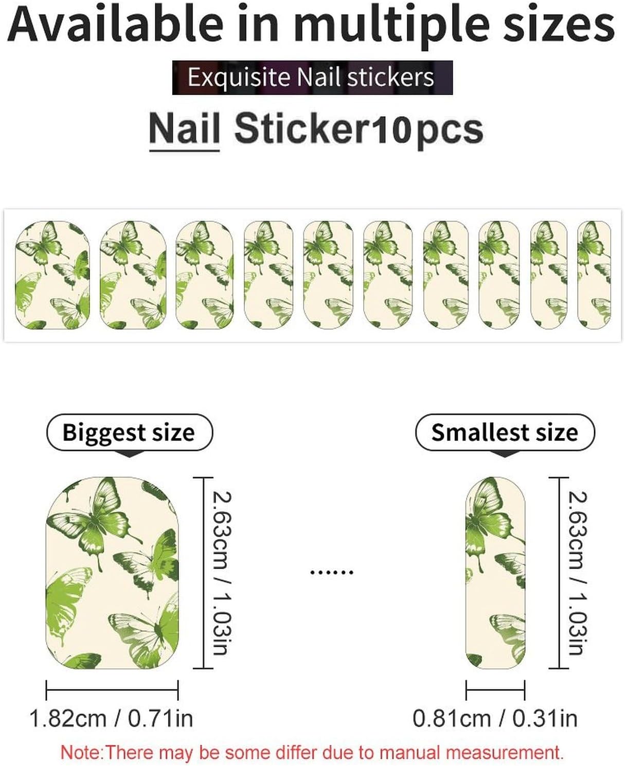 • Package Content: 5 pieces per pack, 10 nail stickers per pack, totaling 50 nail stickers. Each sheet is lightweight and convenient to carry and store without taking up much space. A variety of sizes for you to choose to make your nails look gorgeous at every moment.