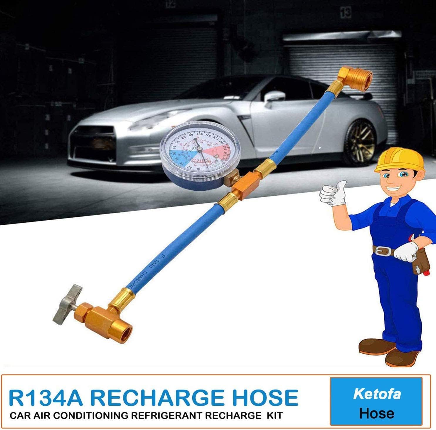 Description; This R134A refrigerant Charge Hose comes with Gauge for easily viewing during use. It features with strong construction with maximum endurance. and the 1/2 thread is specially designed for American and Europe. It will working in adding R134A refrigerant to vehicle with highly working performance. Features Material: Metal and plastic Size: Total length: 39cm/15.3 inch Metal valve with 1/2" fitting 1/2 Thread for American and Europe. For use in adding R134A refrigerant to vehicle with highly working performance. Easy and convenient to use. Come with gauge for easily viewing during use. Package Include: 1x R134A recharge hose