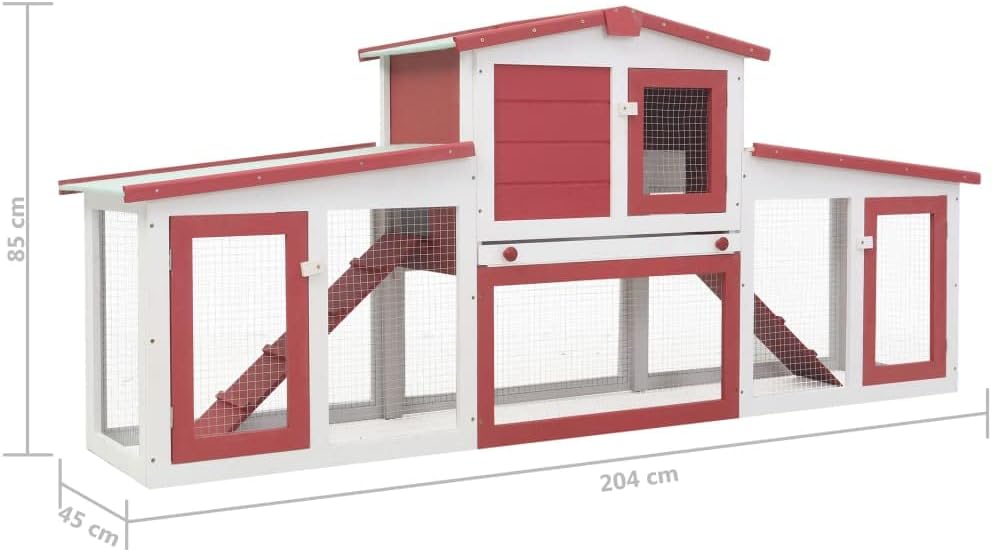 This quality hutch of 2 layers provides a large cozy place for keeping small animals, especially the cute rabbits. It features multiple uses: playing, exercising, training, or simply keeping your pets safely.This rabbit hutch provides your pets with plenty of exercise space while the tight iron wire mesh helps prevent mischievous behaviors and unexpected accidents. Meanwhile, the construction of iron wire grid ensures your monitoring of the pets and enables your pets to keep an eye on the surroundings and get enough fresh air.The rabbit hutch is built with high-quality wood frame, making it a strong and safe enclosure that lasts for years. Its green roof keeps rain away while the cozy cubby makes the perfect sleeping area. Two easy-climb ladders lead from the lower ground level to the upper floor. The pull-out tray makes cleaning easy. And the doors close easily and lock with slide-bolt latches.This spacious wooden rabbit cage is perfect for small pets.Important note: We recommend you placing the rabbit cage under shelter. Accordingly, it will last a longer life.Spacious layoutTotal size: 75'' x 18.1'' x 33.5'' (L x W x H)Inner dimensions: 14.6" x 74.4" x 32.5" (W x D x H)Solid pine wood frame with painted finish, plywoodDurable powder-coated iron wire meshProtection against moisture through green waterproof roofWith two non-slip ladders for easier access to the upper floorA coated pull-out tray for easy maintenanceWeather resistantSuitable for rabbitsEasy to assemble
