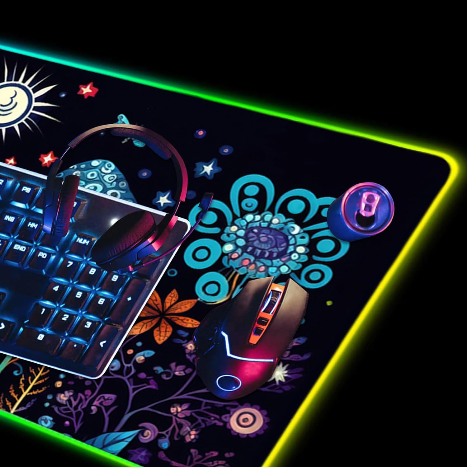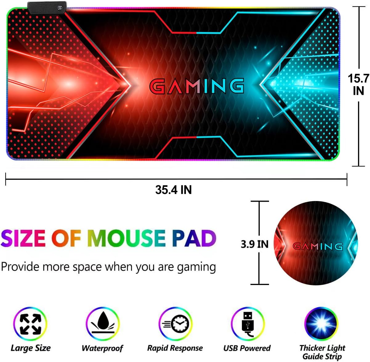 Are you still worried about how to be in the game when the immersion? Are you still worried about how to dress up the game space? Choose DINKY RGB large gaming mouse pad, 14 kinds of lighting mode (red, blue, green, purple, cyan, yellow, light cyan, alternating wave, synchronizing wave, alternating flash, alternating red changing, lights off, synchronize breathing switch at will, for you to eliminate the trouble!!!Product Specification:Size:Large RGB Mouse Pad- 35.4 in x 15.8 in x 0.12 in.Cup coaster- 3.9 in x 3.9 in.The Data Line Length- 1.8m .Material: USB Interface + Non-slip Rubber base + Lycra cloth surfacePackage Included:1 × Large RGB Gaming Mouse Pad.1 x Free cup coaster. 1 x Data Line.