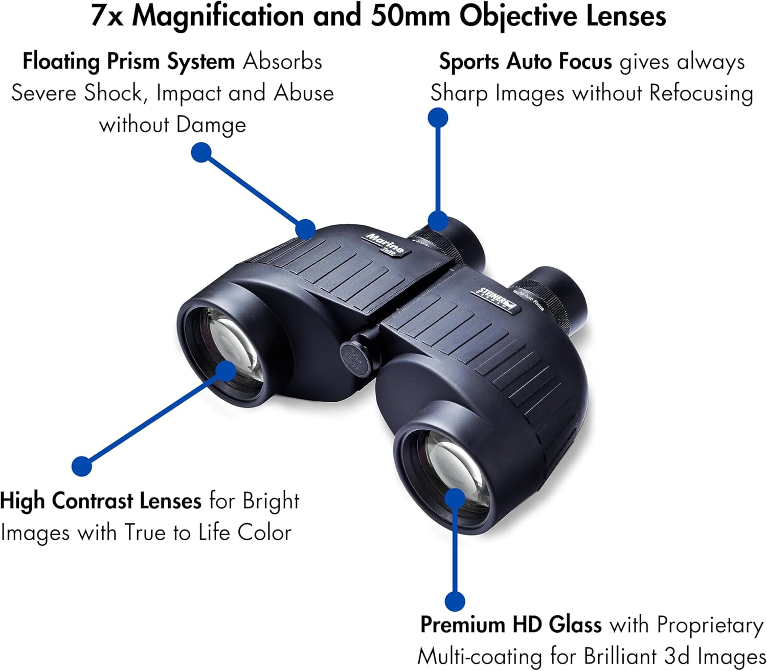 Product Description Take the Steiner Marine 7x50 Binoculars with you on all your outdoor adventures on shore or land. Count on Steiner’s legendary durability and construction that includes a waterproof, shockproof design and 50mm marine coated glass and objective lenses that provide 7x magnification. Our Sports-Autofocus system puts everything into focus from 20 yards to infinity, once it’s calibrated to the user’s eyes. Ideal for marine environments and the outdoors, these binoculars include BAK-4 prisms, fully multicoated optical surfaces and 20mm of long eye relief. Ideal for all conditions, these binoculars transmit available light at over 90 percent. Toss these binoculars in with your boating, outdoor or travel gear. Measuring 8. 1in x 3in x 5. 5in and weighing just 36. 3 ounces, they are the perfect size to be portable and effective. The 7x50 Marine Binocular comes with a neck strap, rain and spray guard for the eye pieces and an attached objective lens caps. Steiner makes trusted optics for life’s defining moments. No matter what you’re looking at, we strive to improve your vision so that nothing escapes you. Amazon.com Big on performance and generous on economy, Steiner's 7x50 Marine binocular is ideal for both boaters and shore-bound users. The binocular is equipped with marine glass that's built to traditional Steiner navy/military styling, from its sharp and incredibly bright optics to the easy-to-grip exterior. The Sports-Autofocus system, meanwhile, puts everything into focus from 20 yards to infinity once calibrated to the user's eyes. Most importantly for boaters, however, is the binocular's waterproof and shockproof housing, which protects the optics should you accidentally drop the binocular into a body of water. Other details include BAK-4 prisms, fully multicoated optical surfaces, an easy-to-grip exterior, outstanding light transmission that peaks over 90 percent, and 20mm of long eye relief. The 7x50 Marine binocular--which comes with a web strap, a rain and spray guard for the eyepieces, and an attached objective lens cap--is backed by a 10-year warranty. Specifications:Objective lens: 50mm Magnification: 7x Field of view: 354 feet @ 1,000 yards Eye relief: 20mm Dimensions: 8.2 by 2.8 by 5.2 inches (W x H x D) Weight: 37 ounces