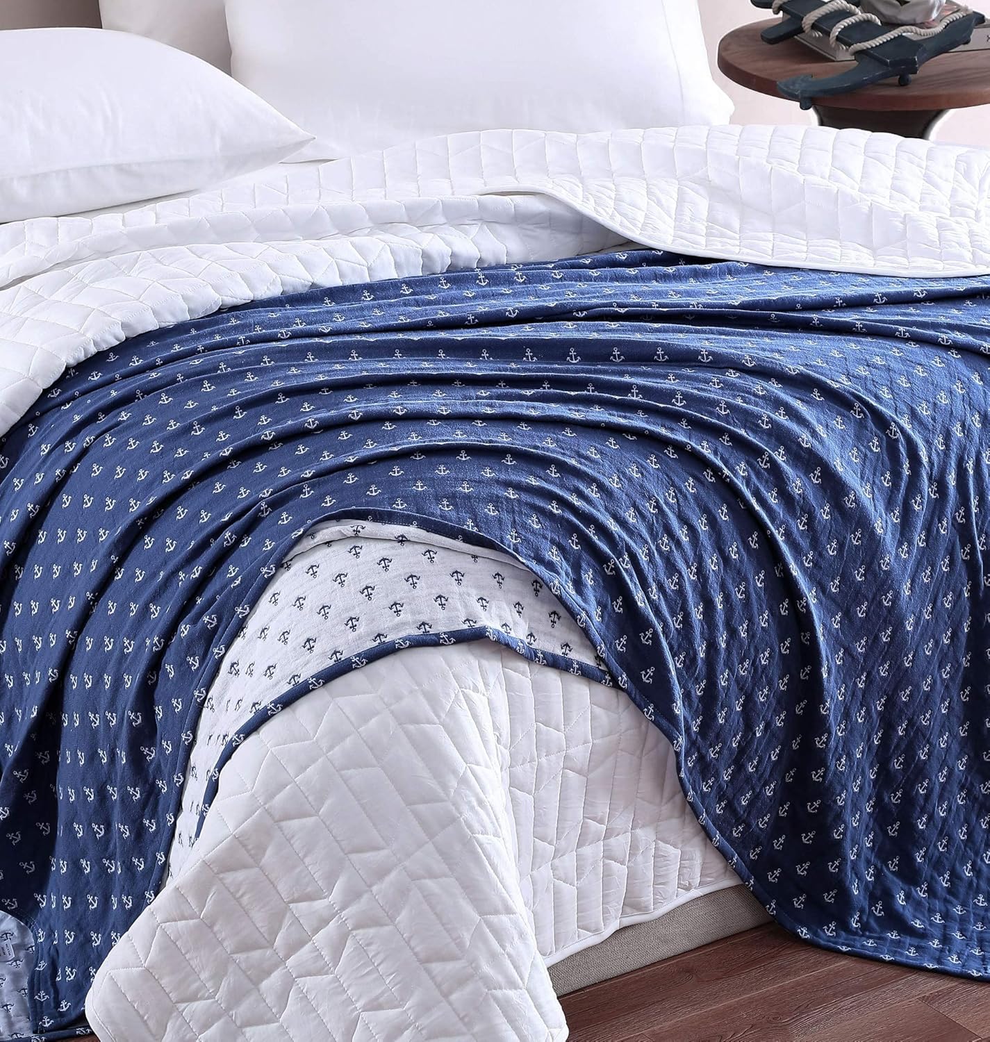 Looking for a comfy and soft throw blanket? This cute and cuddly blanket will send you peacefully into the night with its inviting design and cozy, quilted construction. Give your space a nautical ambiance with this anchor print blanket. Featuring a lush 100% soft washed cotton muslin blanket that is lightweight gauzy blanket is gentle to the touch and provides breathable comfort for a better nights sleep. A great all season blanket, perfect for the hot summer nights and great as a layering piece for winter. A great choice whether you use this for your bed, sofa, couch, or anywhere at home or on a trip.