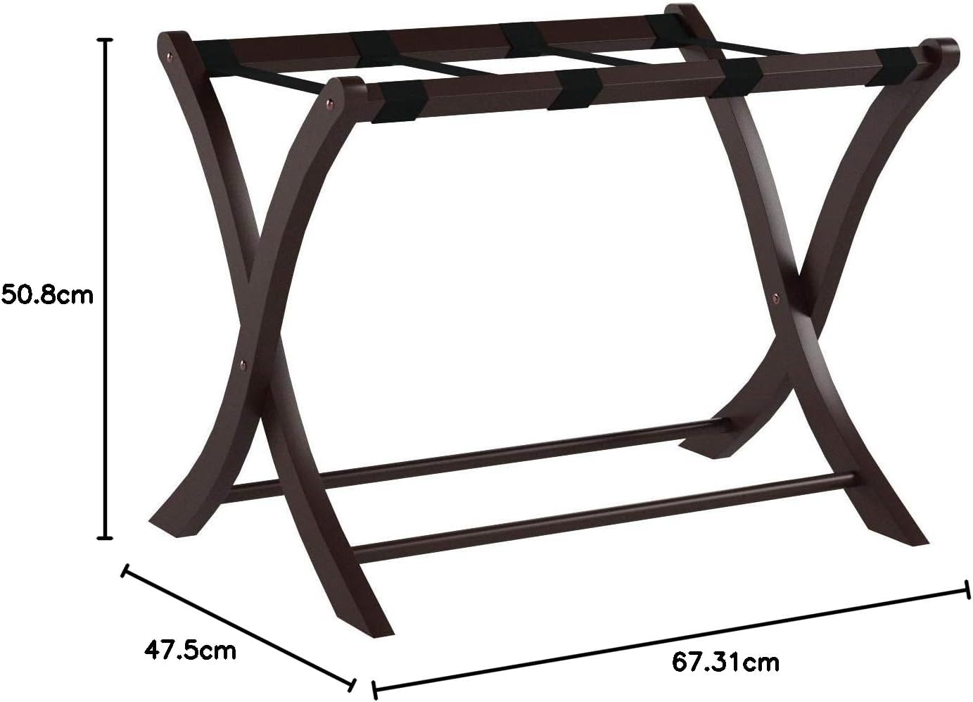Overnight guests will thank you for the Scarlett Luggage Rack, where they can set their luggage and unpack. Made of Solid Wood in a lovely Antique Walnut finish with thick, sturdy straps, the rack will hold a heavy suitcase. The curved-leg frame folds easily when not in use.