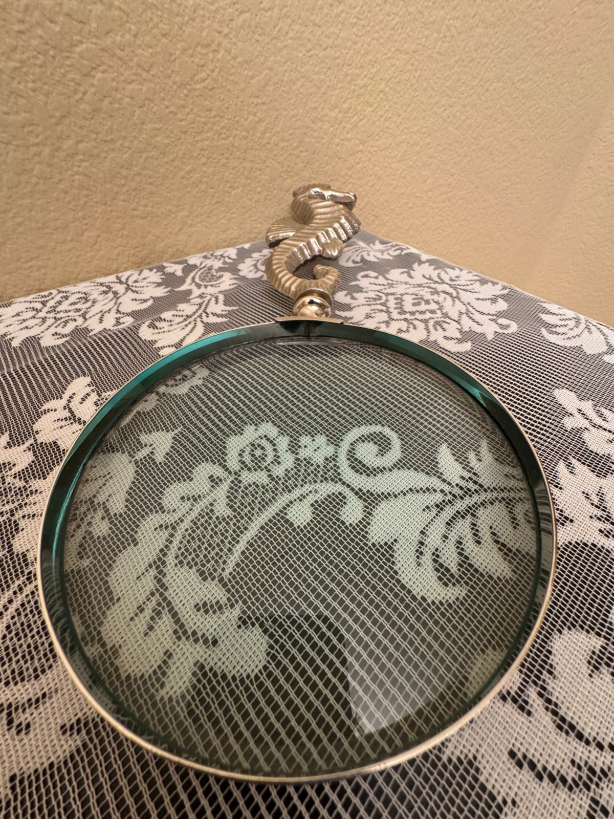 This vintage inspired, elegant magnifying glass features a solid silver handle shaped like a seahorse. Both functional and decorative, the glass lens magnifies fine print & small objects, while the whimsical nautical flair adds charm to any office or bookshelf.